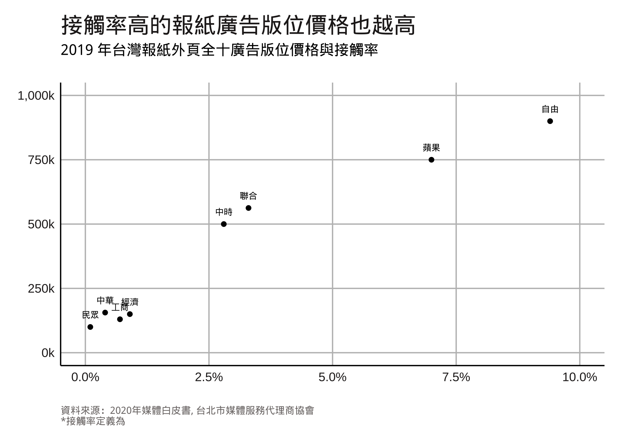白皮書中也整理了各家報紙的廣告價格、閱讀率等資訊,裡面幾乎涵蓋了台灣所有的報紙4。雖然資料點不多,但幾乎可以在圖上直接畫出一條精美的斜直線,顯示報紙的廣告價格和閱讀率呈現明顯的正向線性關係。