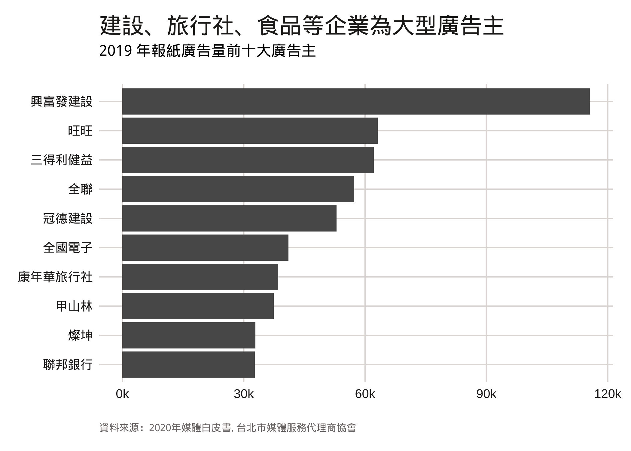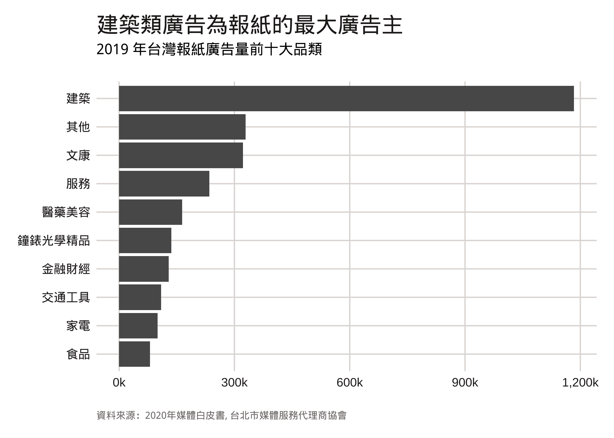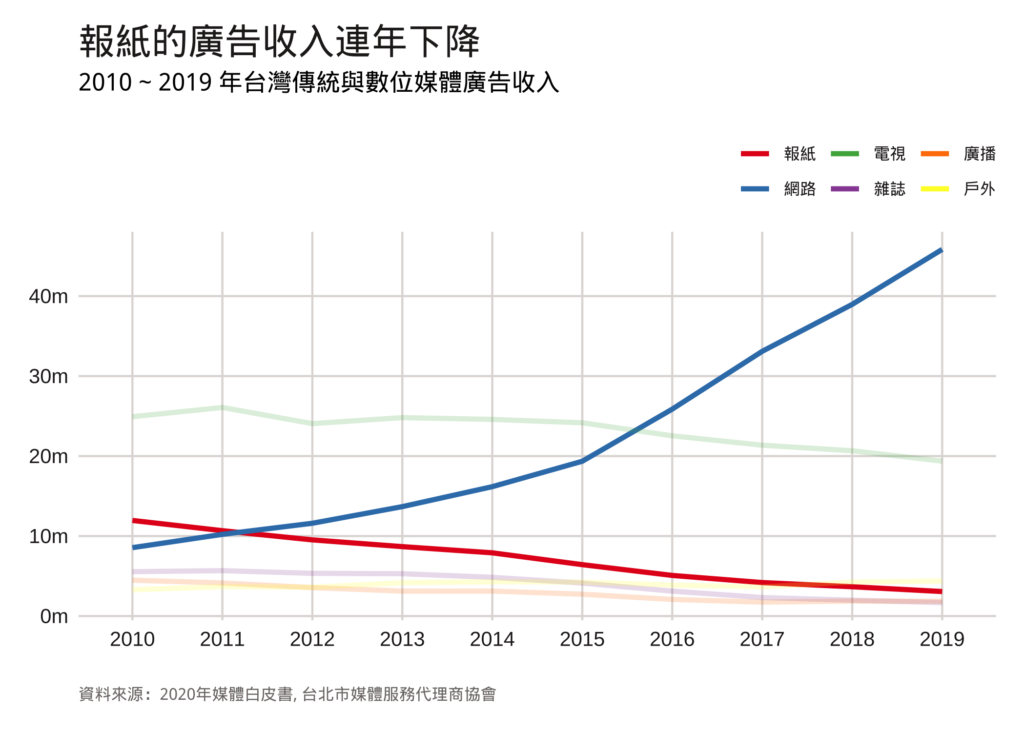在台北市媒體服務代理商協會每年出版的媒體白皮書中,都會整理台灣傳統媒體與數位媒體的廣告收入。傳統廣告資料來源是尼爾森(Nielsen)的廣告監播服務,數位廣告資料來源則是台灣數位媒體應用暨行銷協會(DMA)。