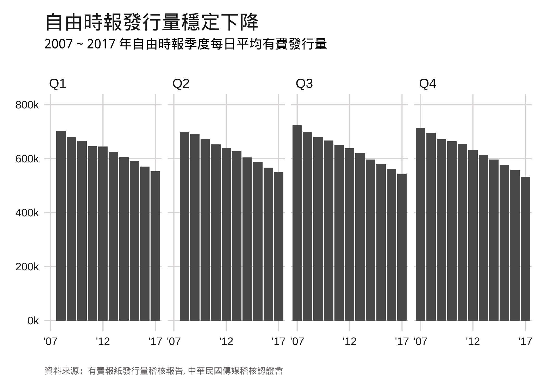 因為發行量受季節波動影響,我將資料依照季度拆分後再各自比較。從圖中可以發現,無論是一年中的哪個季度,自由時報的發行量都穩定下降。