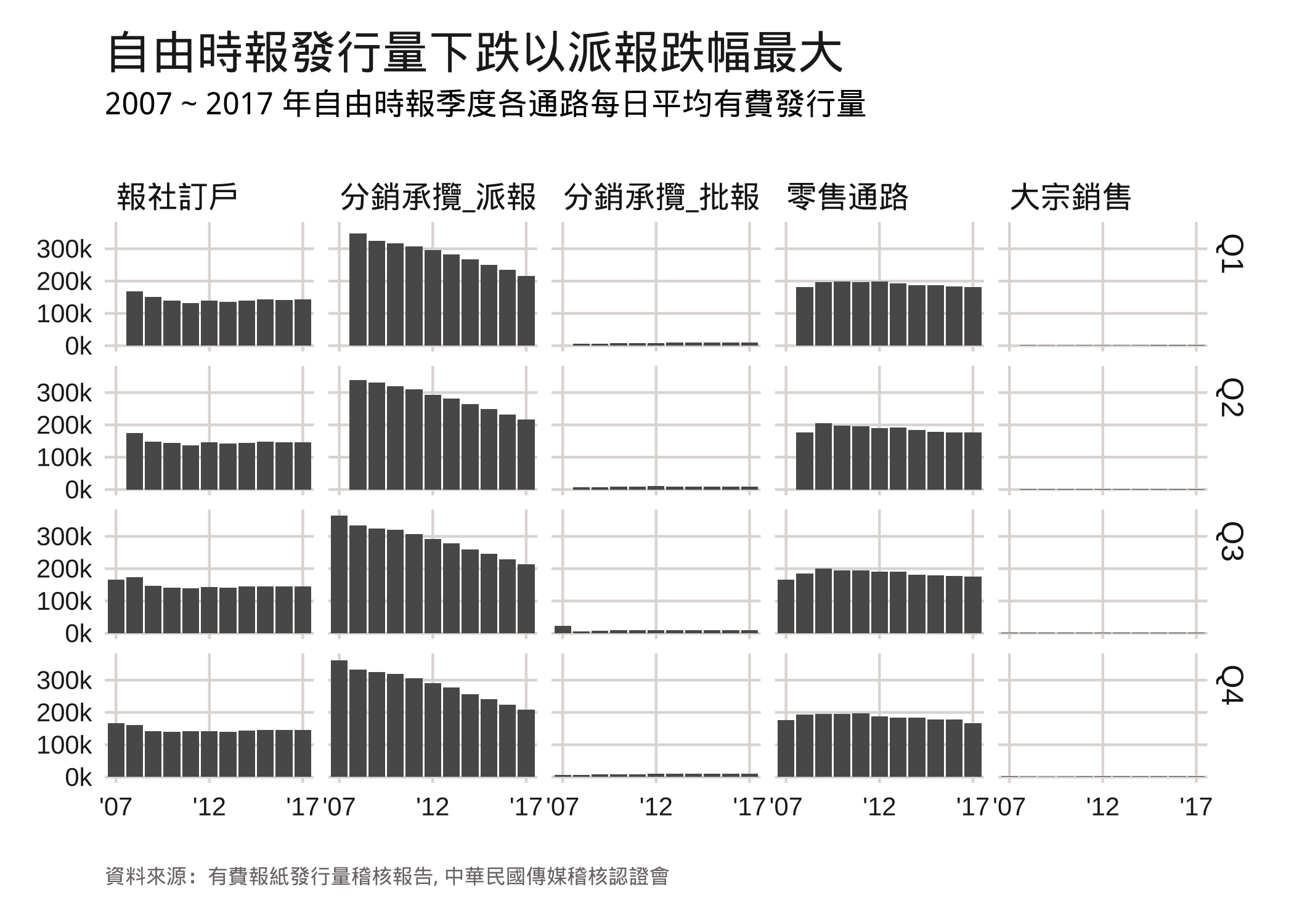 然而,每年、每季度銷量的顆粒度太粗,只能知道發行量下跌,還是無法確定發行量下降的原因,是因為訂戶減少?還是因為零售銷量下降?先前也有新聞提到有些公部門陸續停訂報紙,也就是大宗銷售量下滑,會是這個原因嗎?所以,我先利用分銷通路(channel) 拆分自由時報的發行量。