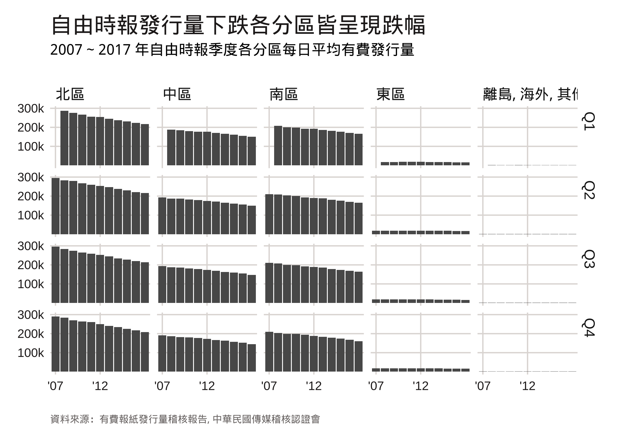 除了通路以外,我再從區域的角度切分銷量數字。想問的問題是,有沒有可能北部人逐漸不那麼愛看報紙了?如圖所示,無論北、中、南、東、離島海外與其他,各區都呈現全面性的下降。