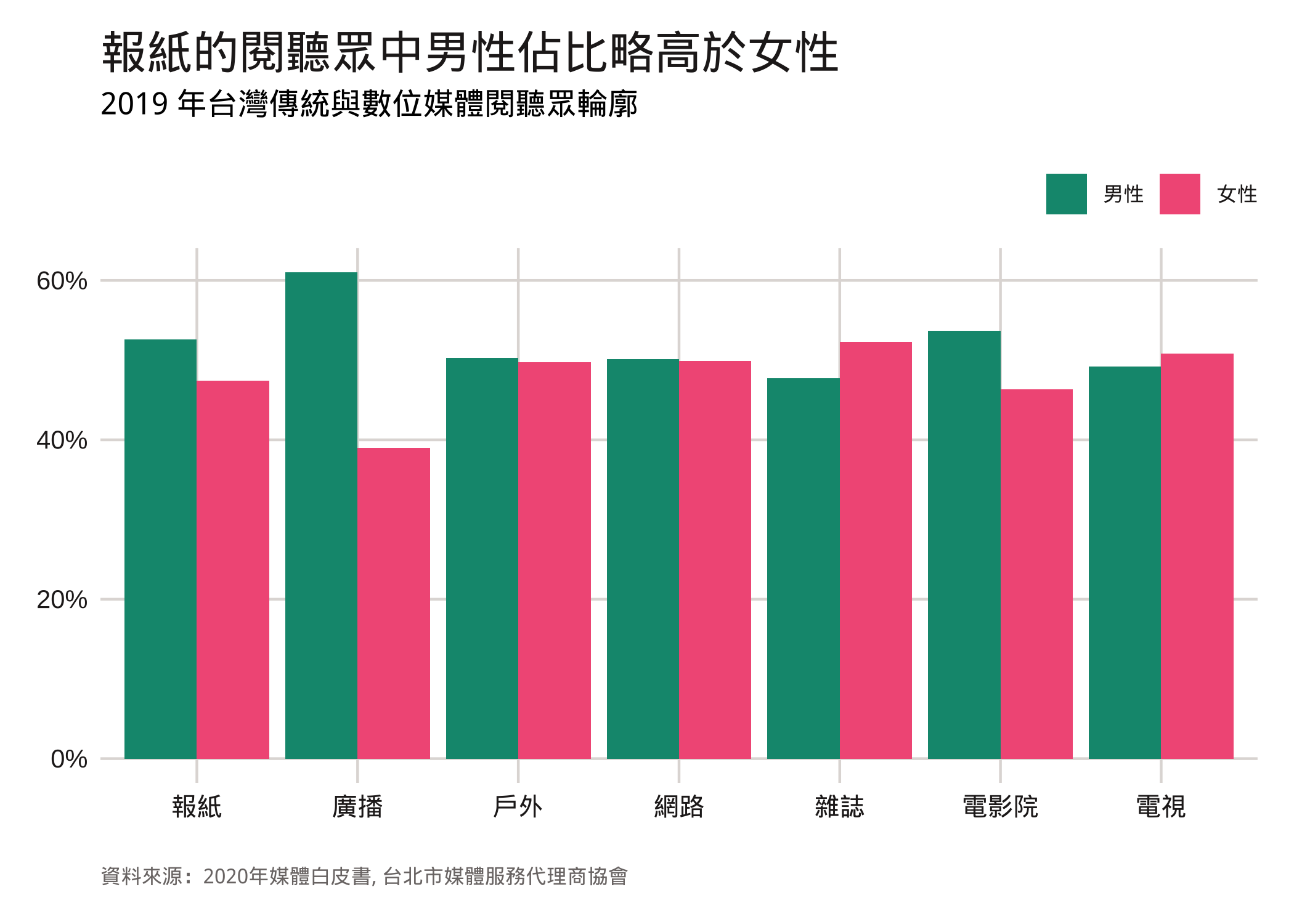 除了廣告收入以外,媒體白皮書同時也整理各類媒體的基本資訊,因為受眾的輪廓是廣告效果的基石,底下也選錄白皮書的媒體受眾數據,並繪製成圖表。