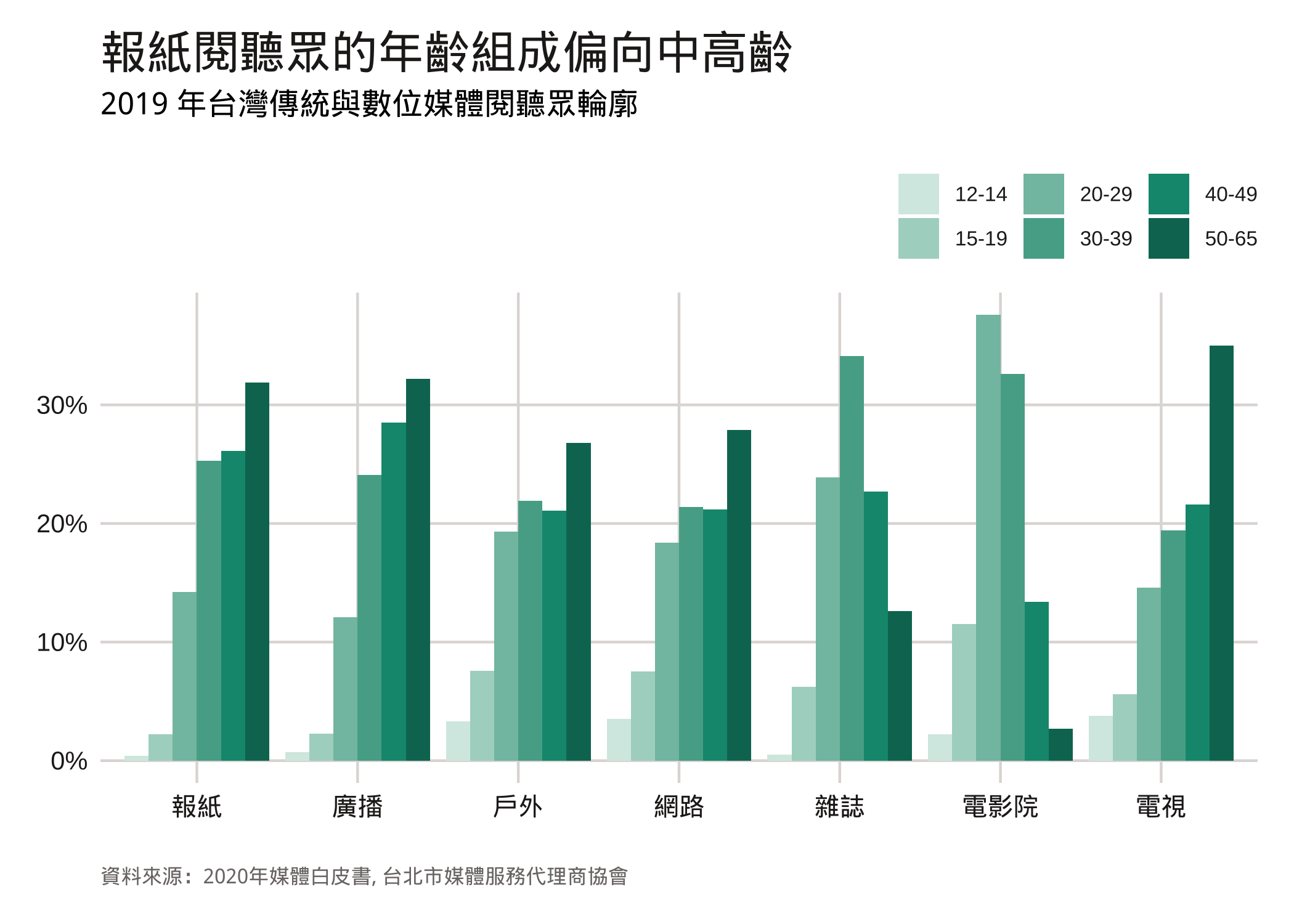 改看年紀,報紙的受眾年齡組成偏向中高齡,分佈呈現負偏(negative skew),且相較於其他媒體,報紙缺少 20 歲以下的閱讀年齡層,廣播和雜誌也有類似情況。相較於報紙,儘管電視也是以中高齡閱聽眾人口居多,但仍舊有一定數量的年輕收視族群,網路亦然。