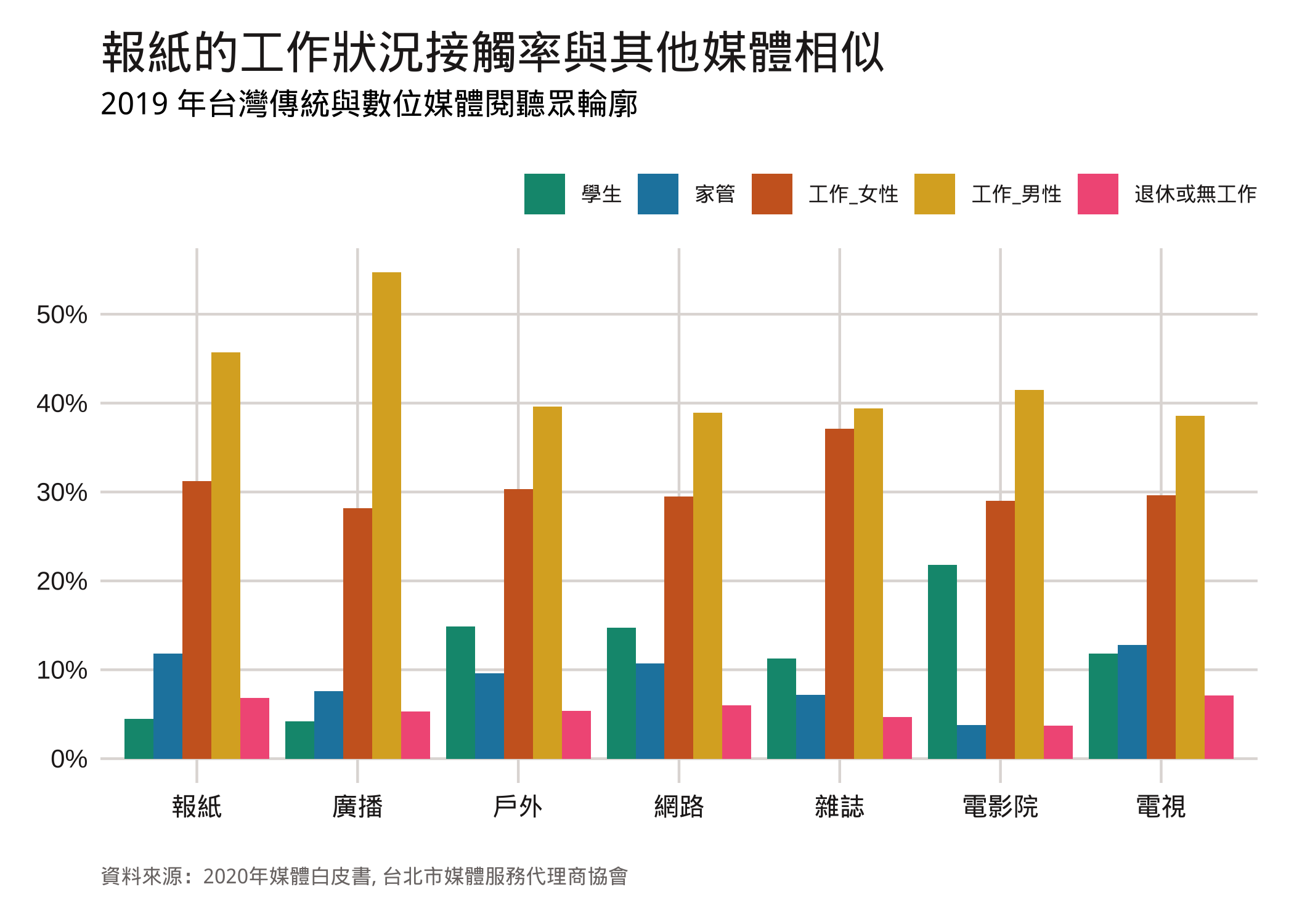 就工作狀況而言,因為調查方法的局限,僅能有分類較粗的學生、家管、工作中、退休或無工作等族群劃分,各媒體都以工作中的男性最多,工作中的女性次之。和前一項年齡分佈的發現相似,收看報紙和收聽廣播的學生族群佔比最低,不若網路、電影院等媒介,學生族群都能排上第三。